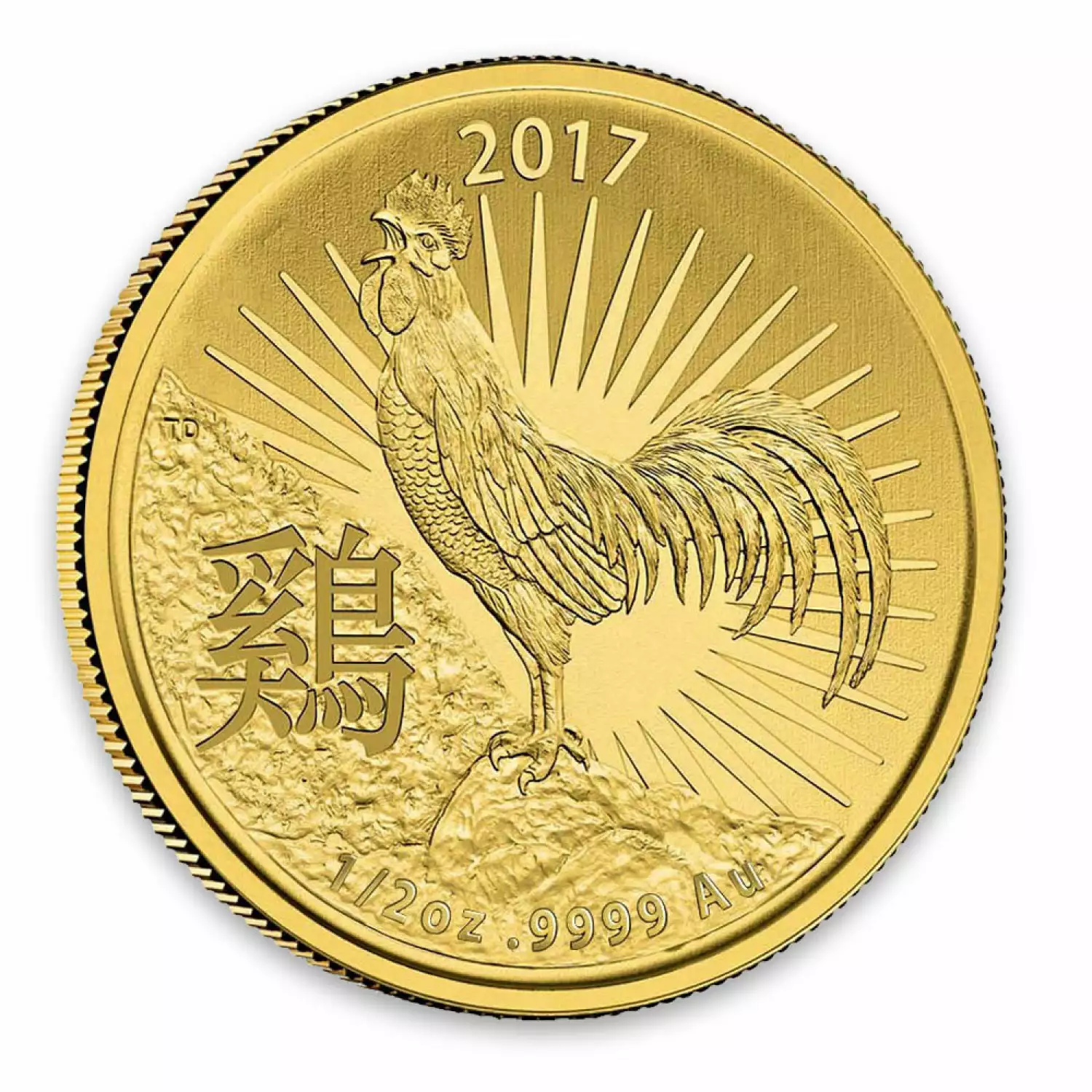 The 2017 Royal Australian Mint 1/2 oz Year of the Rooster is composed of 0.5 oz of .9999 actual gold.