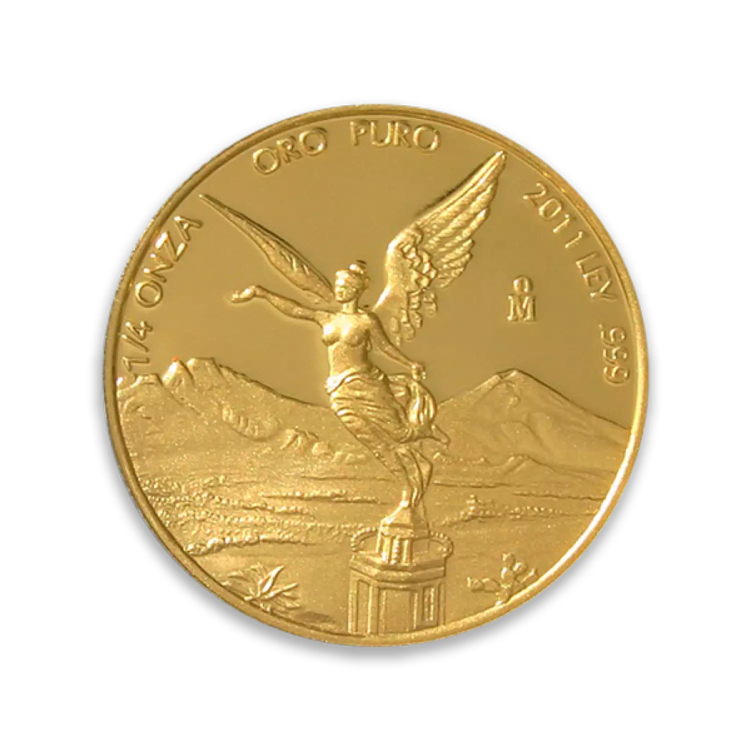 The Obverse of the 1/4 oz Gold Libertad features the Mexican National Seal with the official name for Mexico in Spanish: "Estados Unidos Mexicanos." The Reverse portrays two key symbols of the Mexican people: the Winged Victory statue in the forefront and the Mexican volcanoes Popocatépetl and Iztaccíhuatl in the background.