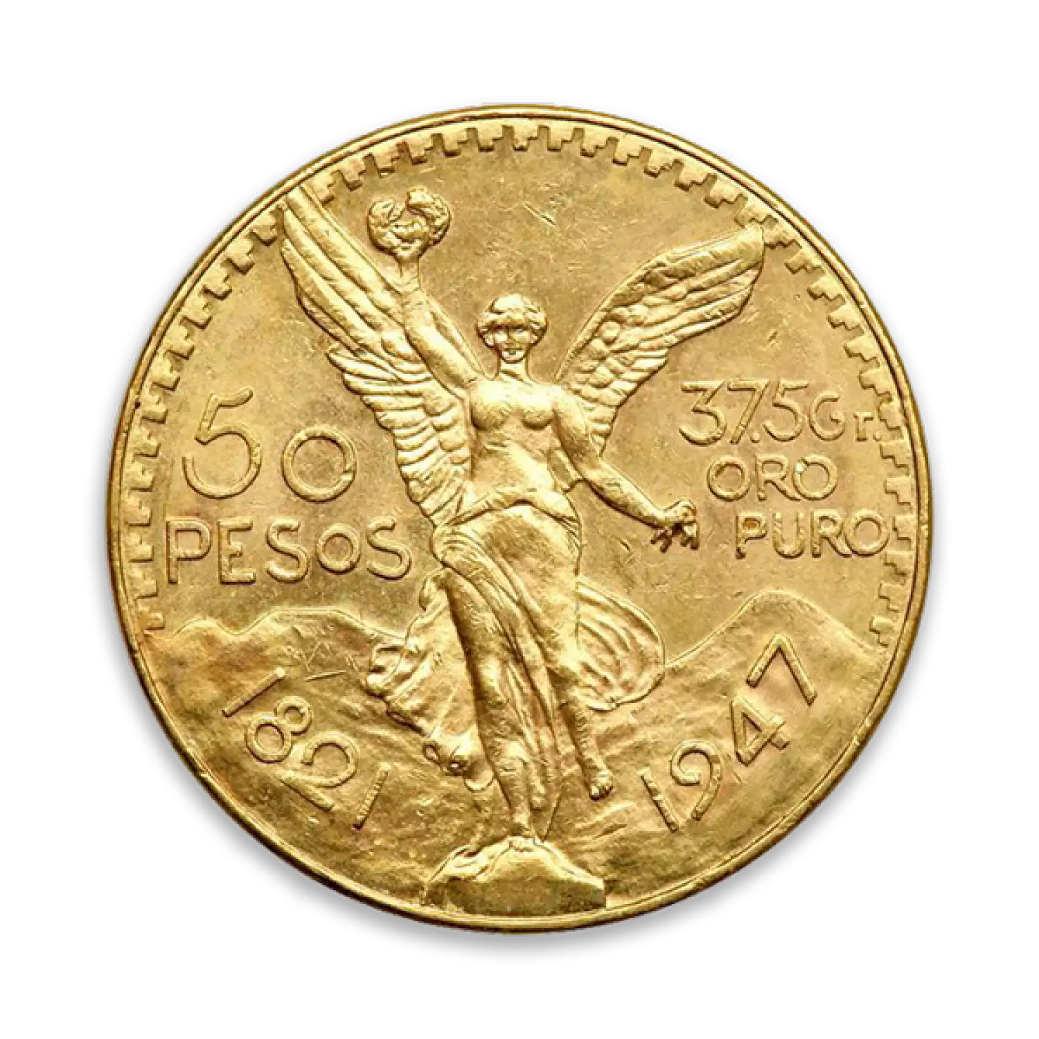 Each Mexico 50 Peso Gold Coin contains 37.501 grams of gold. The obverse of the Mexican 50 Pesos Gold Coin features the image of Winged Victory, with a laurel wreath in her right hand and broken chains in her left.