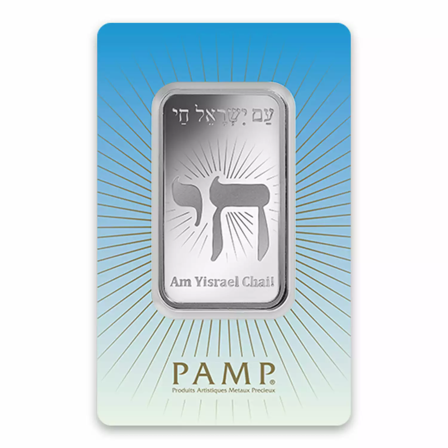 Each 1oz PAMP Silver Bar - Am Yisrael Chai! is composed of 1 troy ounce of .999 fine silver. The most popular sizes when you buy silver are 1oz, 10oz, and 100oz. Many other sizes exist but those silver bar or silver round sizes are not as popular.