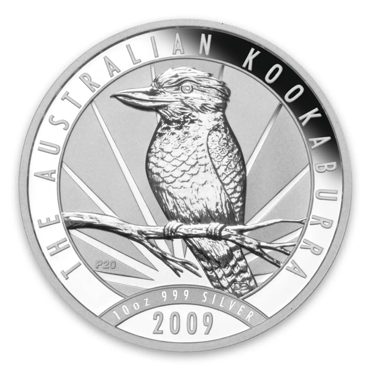 The 2009 10oz Australian Perth Mint Silver Kookaburra features a kookaburra perched on a tree branch, designed by Darryl Belloti. Each silver coin weighs 10 troy ounces and 0.999 fine silver.