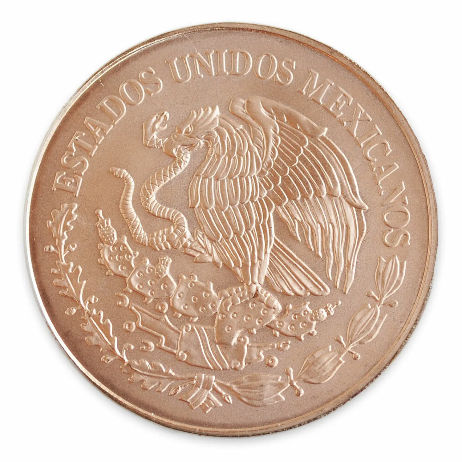 On the obverse of the coin is the national coat of arms of Mexico. It shows an eagle with a snake in its beak on top of a cactus. The reverse has the Winged Victory statue that can also be seen in the center of Mexico City on top of its Column of Independence of Spanish rule.