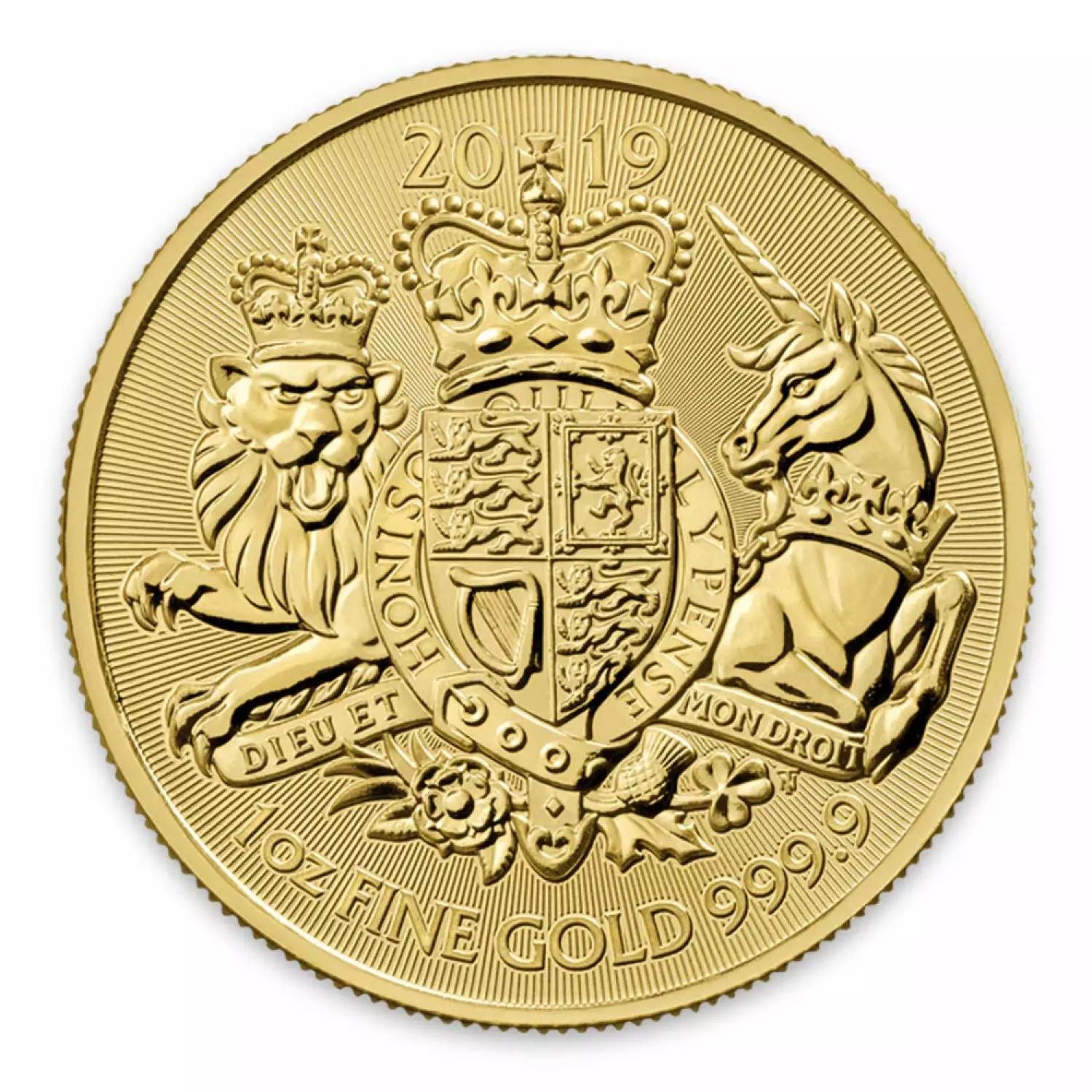 This Gold bullion coin from The Royal Mint features the Royal Arms, a symbol of strength and majesty. The awe-inspiring design is depicted on 1 ounce of .9999 fine Gold, and is the newest addition to The Royal Mint Gold bullion range.