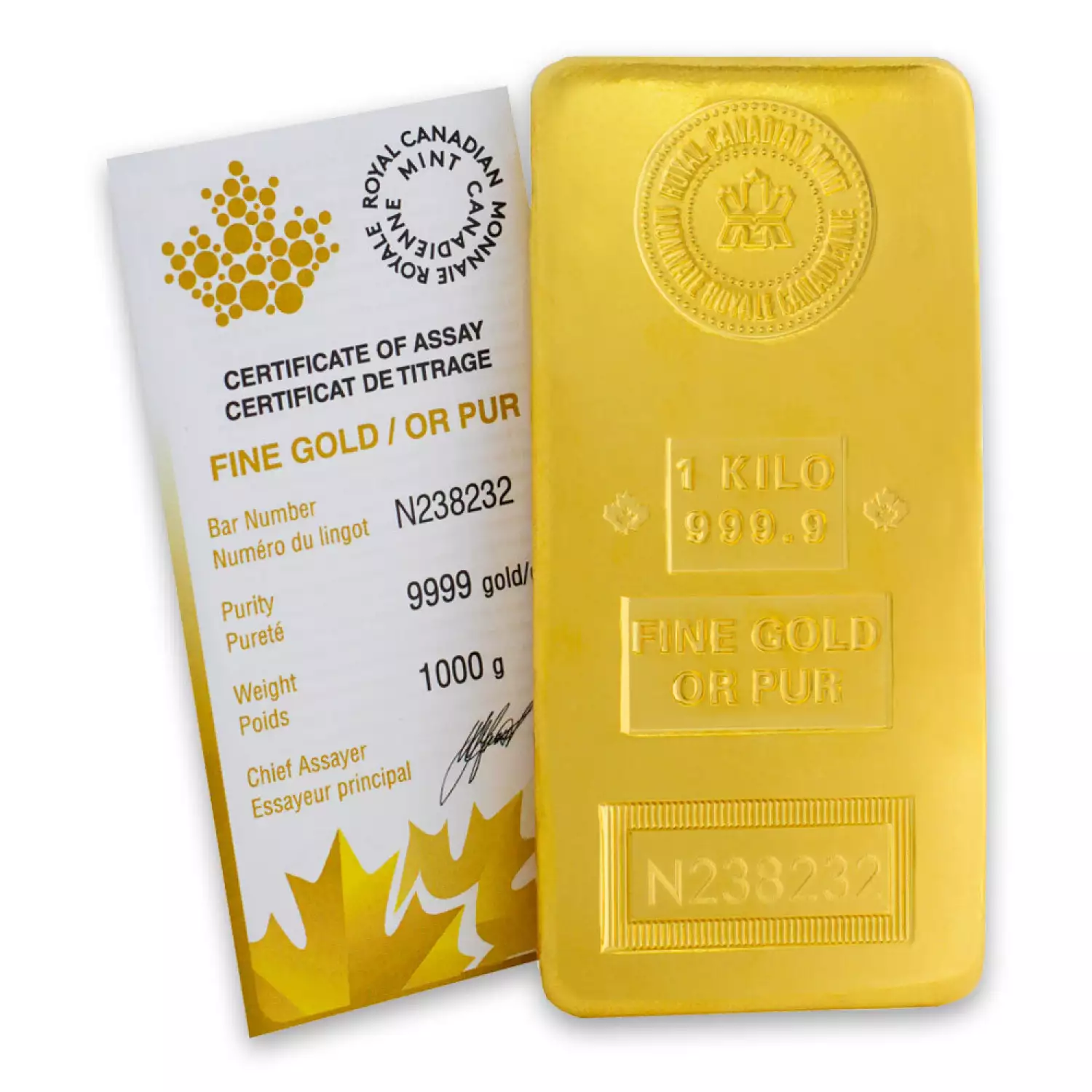 The stunning 1 kg RCM Gold Bar is manufactured by the well-known Royal Canadian Mint. This .9999 fine Gold bullion bar is highly popular among investors and collectors. Each 1 kg Royal Canadian Mint bar contains 1 kilogram of .9999 fine gold. These gold bars are guaranteed for their weight and pure gold content. These dazzling gold bars are eligible for Precious Metals IRA.