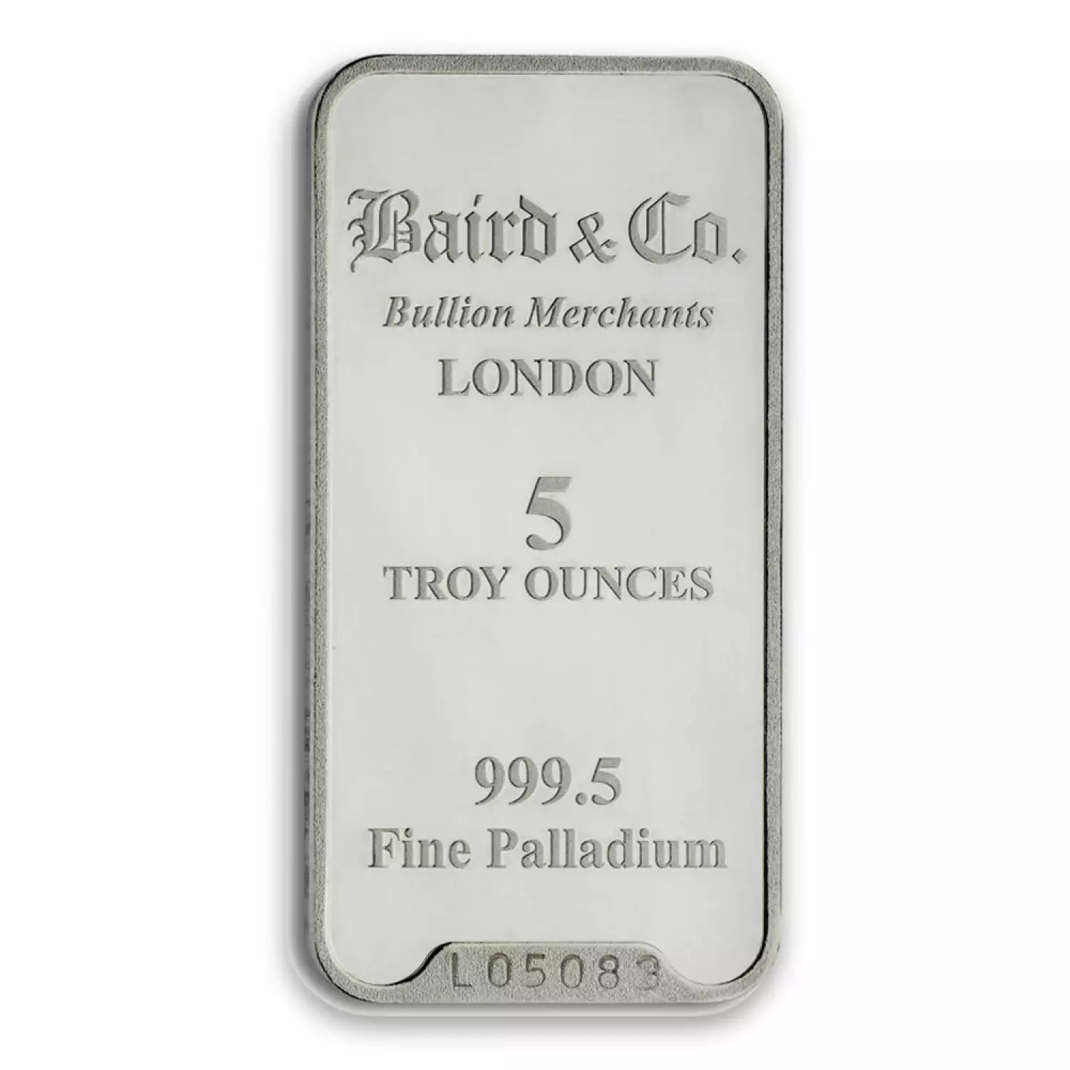 Baird & Co. is a United Kingdom mint producing palladium bars since 1967. Bullion bars come in three different types i.e. cast, minted or extruded. Each 5 oz Baird & Co Palladium Minted Bar contains 5 troy ounces of .9995 fine palladium.