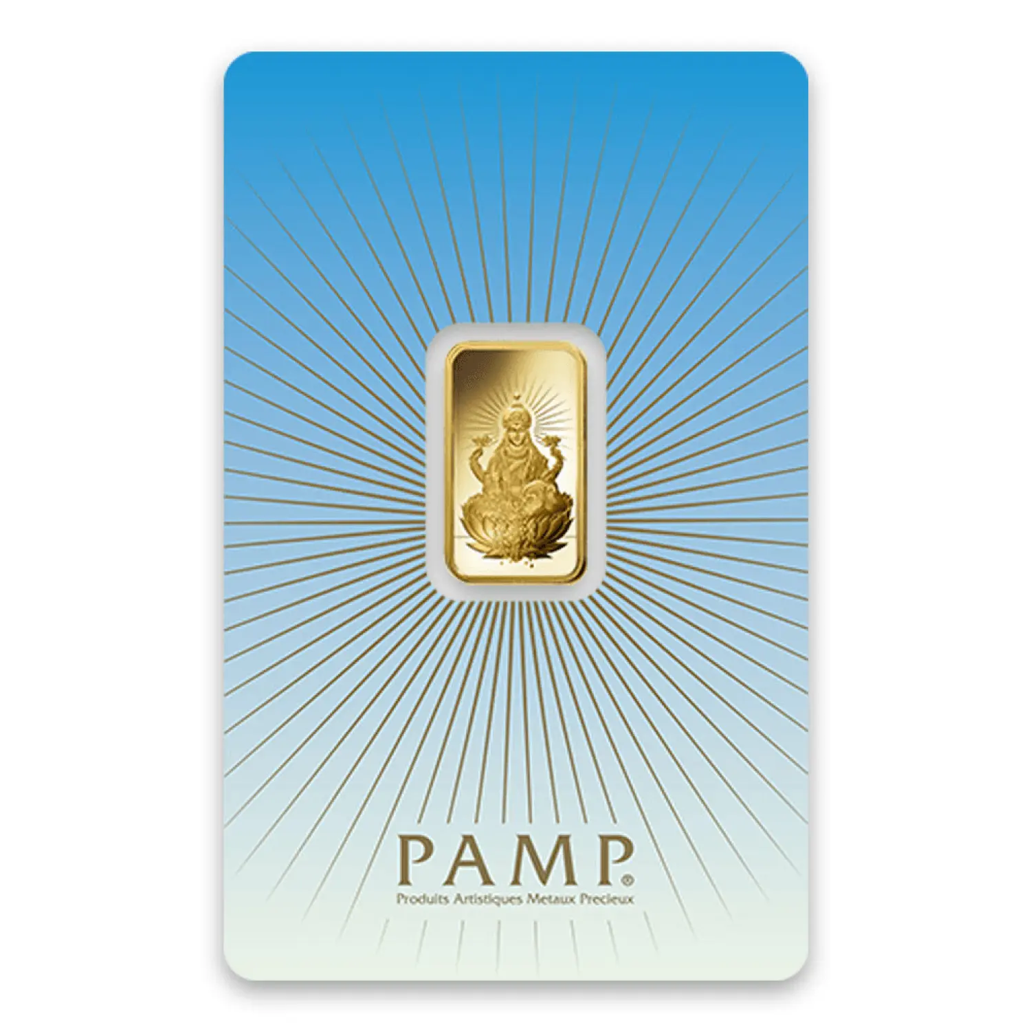 The 5g PAMP Gold Bar - Lakshmi celebrates the Hindu faith. This gold bar features a design depicting Lakshmi- the goddess of wealth, fortune and love. The reverse of this stunning gold bar depicts the weight and purity and also the serial number unique to each bar.