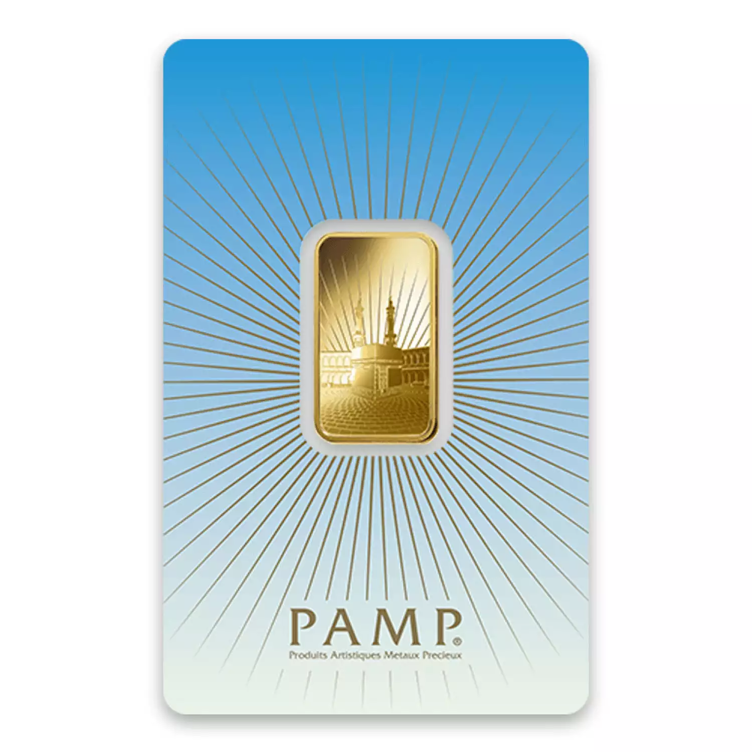 The Obverse of the gold bar depicts a depiction of the Ka`bahsmall shrine in Ka`bah, Mecca. The Reverse features the PAMP Suisse logo, weight and purity along with a unique serial number.