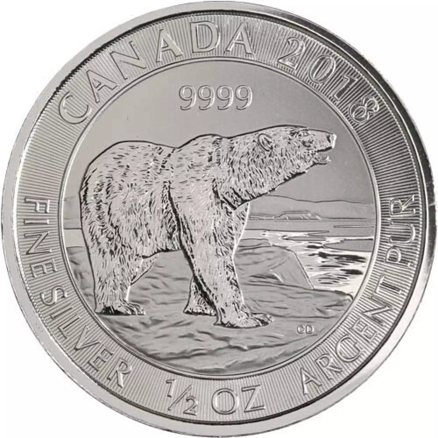 The Canadian Silver 1/2oz polar bear coin is a truly collectible bullion coin. This silver coin depicts a massive adult polar bear at the edge of an ice shelf in the far north Canadian Arctic. The polar bear is the largest of all bears and is the only bear that will actively hunt humans.