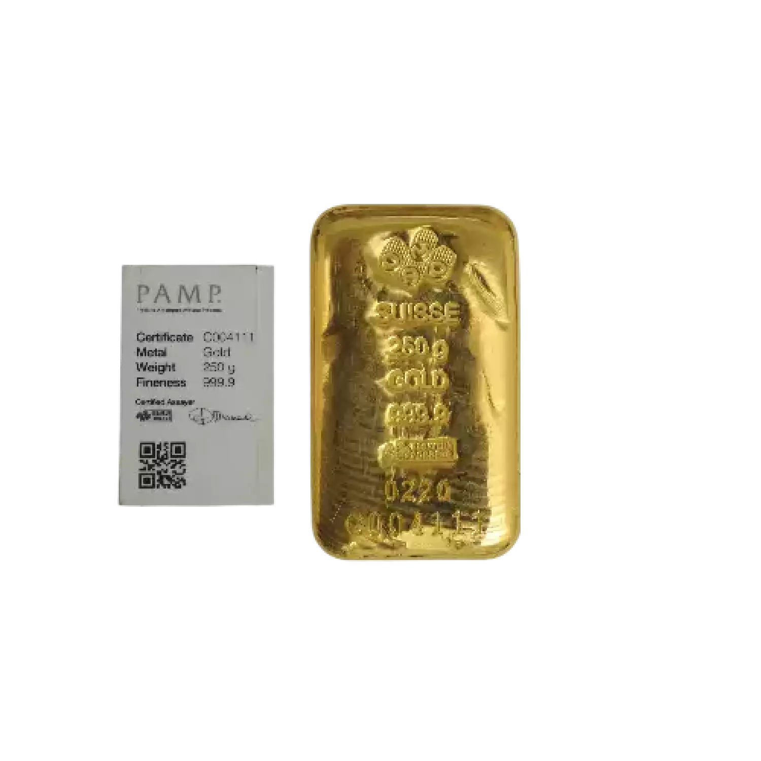 The 250g PAMP Suisse gold bar is Accredited as “Good Delivery” by the Swiss National Bank and the London Bullion Market Association.