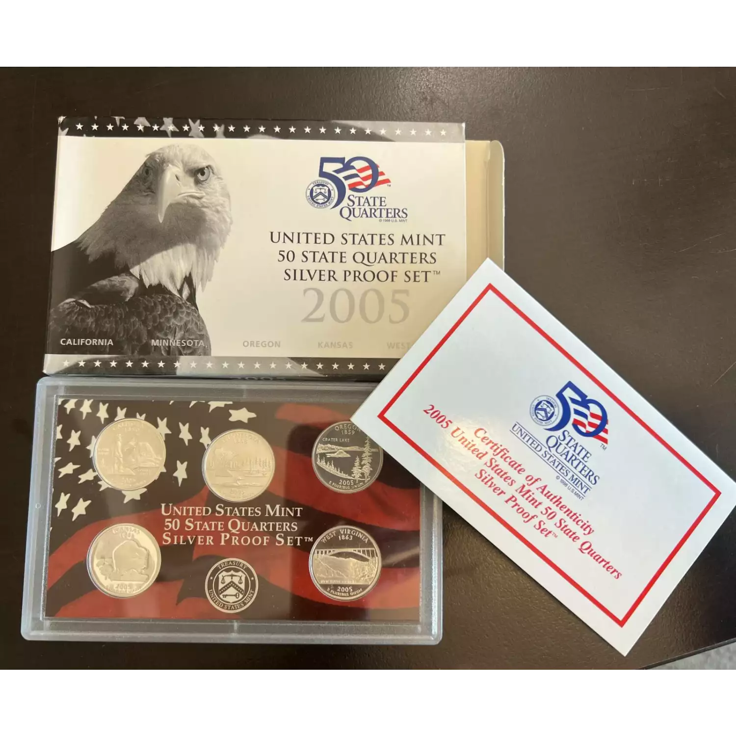 THE SET YOU RECEIVE IS OUR CHOICE. IT WILL BE A SET ESTIMATED TO BE OF THE GRADE / QUALITY INDICATED. THE IMAGE SHOWN IS AN EXAMPLE ONLY. Mint Proof Set - 2005S 5 Piece Quarter Silver ($1.25 FV) - Set