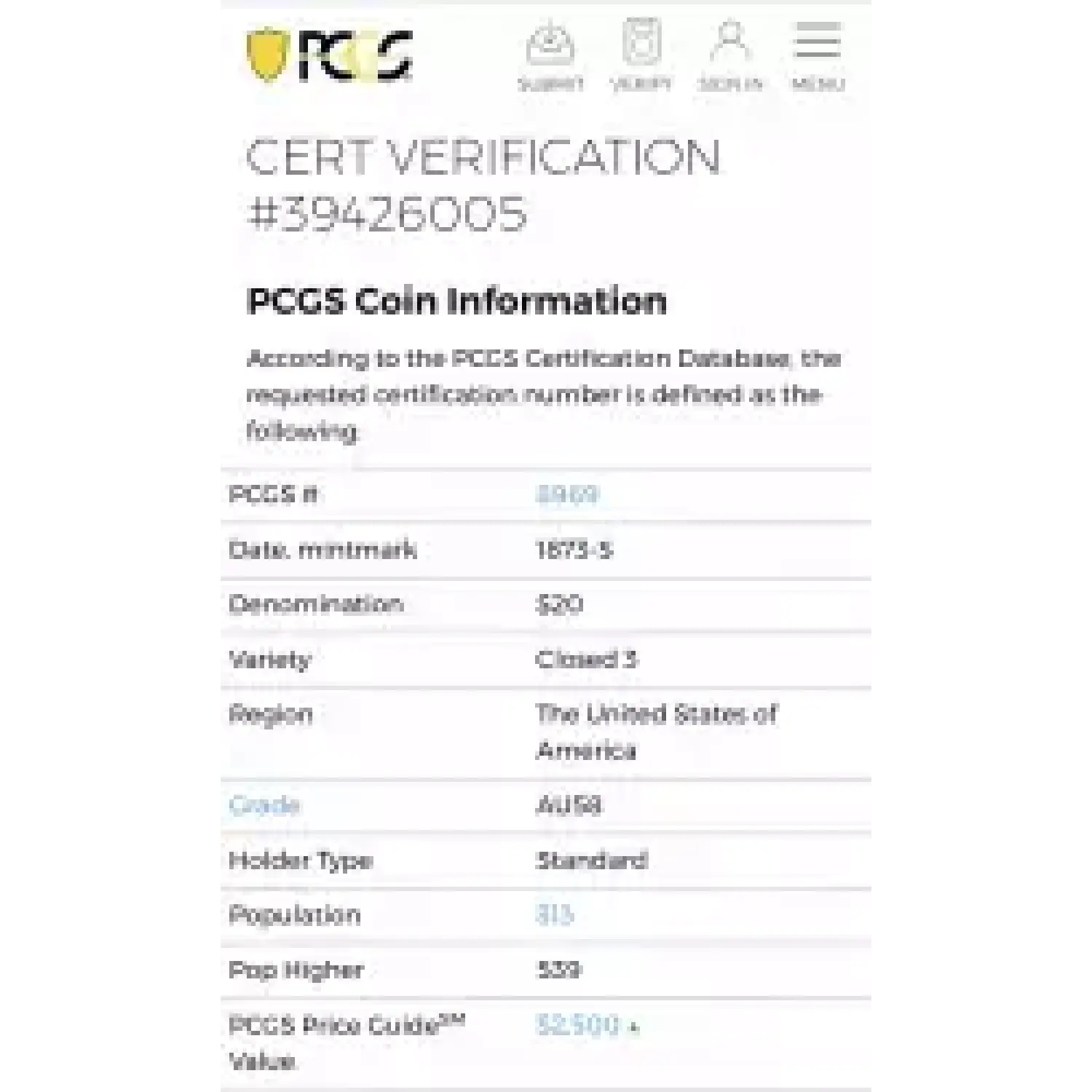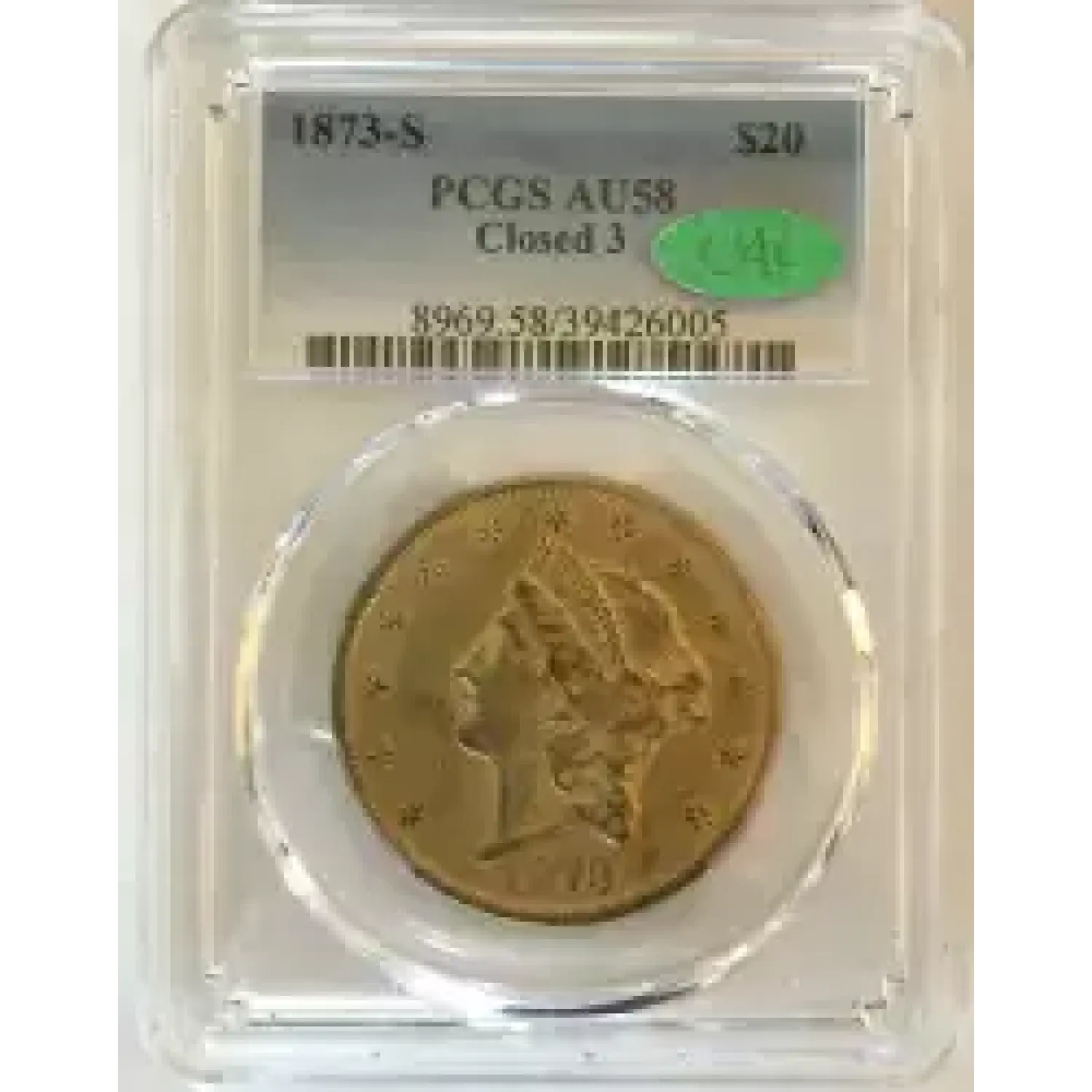 1873-S Double Eagles Liberty Head PCGS AU-58 Closed 3 CAC