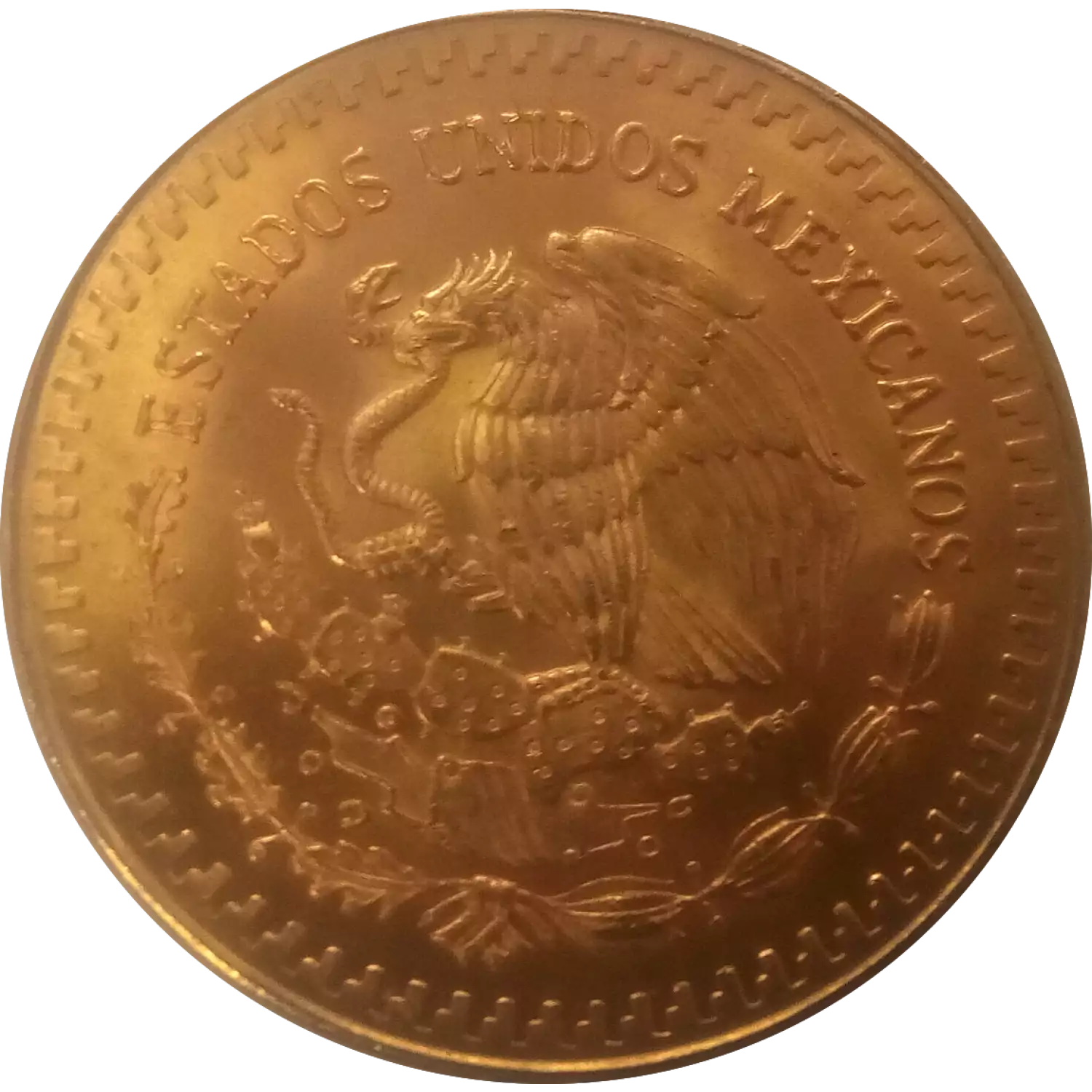 Obverse: Features a sculptural relief design of the National Shield, encompassed by the legend "Estados Unidos Mexicanos" (United Mexican States).