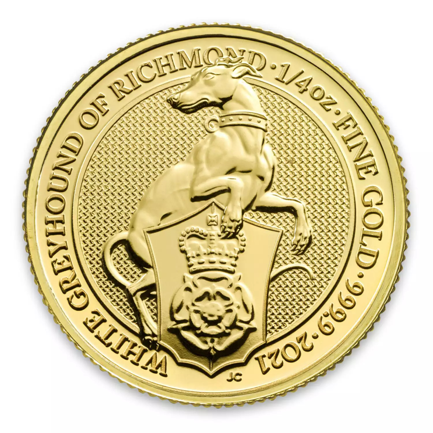 The 2021 1/4oz Britain Queen's Beasts: The White Greyhound of Richmond is the first release in an exciting new 10 coin series. The Britain Queen's Beasts celebrate the British Monarch and the centuries of fascinating heraldry. This gold coin contains 1/4 oz of .9999 fine Gold. The reverse, designed by Jody Clark, depicts the White Greyhound of Richmond along with the representative sea of the Tudors.