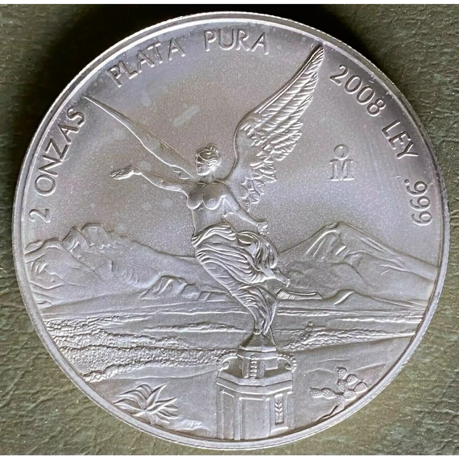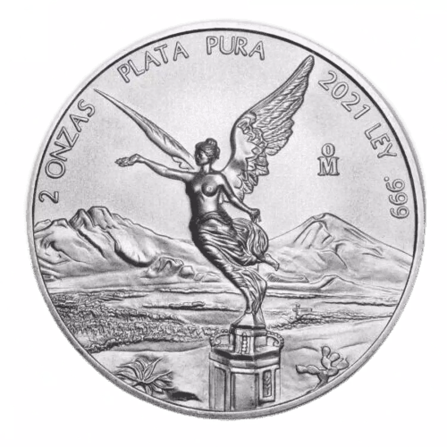 A winged Victoria of Mexican Independence Victory Column in front of a landscape with the volcanoes Popocat’petl and Iztaccihuatl graces the front, while the reverse contains the coat of arms of Mexico surrounded by historical mexican coats of arms.