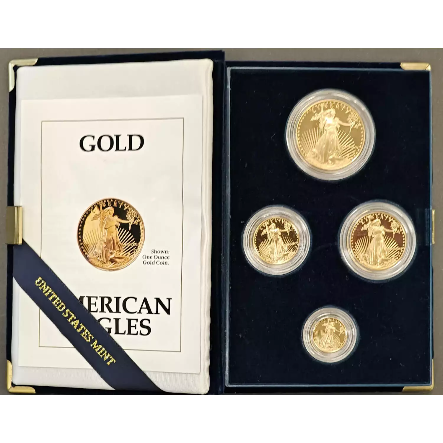 To complement and protect these stunning refreshed and new designs, each coin is encapsulated, with the set placed in a single black presentation case with the United States Mint seal on the lid. The case fits into an outer sleeve with a beautiful gold foil image of Liberty. The case includes a certificate of authenticity with matching imagery.
