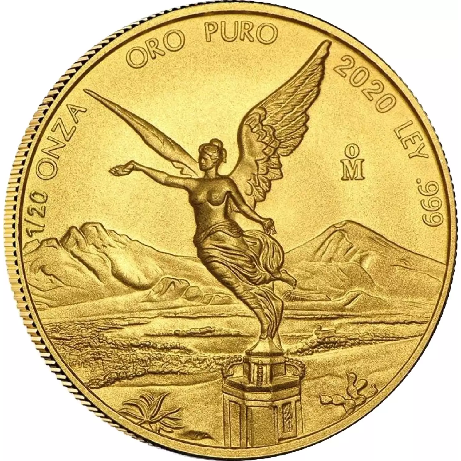 The reverse highlights the Mexican Coat of Arms, with an eagle clutching a snake in its beak and talon. The image is surrounded by the words "Estados Unidos Mexicanos" above, and an olive and oak wreath sits below.. The obverse displays a depiction of the "El Ángel", or Angel of Independence, which sits in the center of Mexico City and celebrates the start of Mexico's War of Independence. Victoria, the Roman goddess of victory, holds a laurel wreath in her outstretched hand. Her other hand grasps a broken chain, which symbolizes freedom. The background features two of Mexico’s most iconic volcanoes, Popocatepetl and Iztaccihuatl.