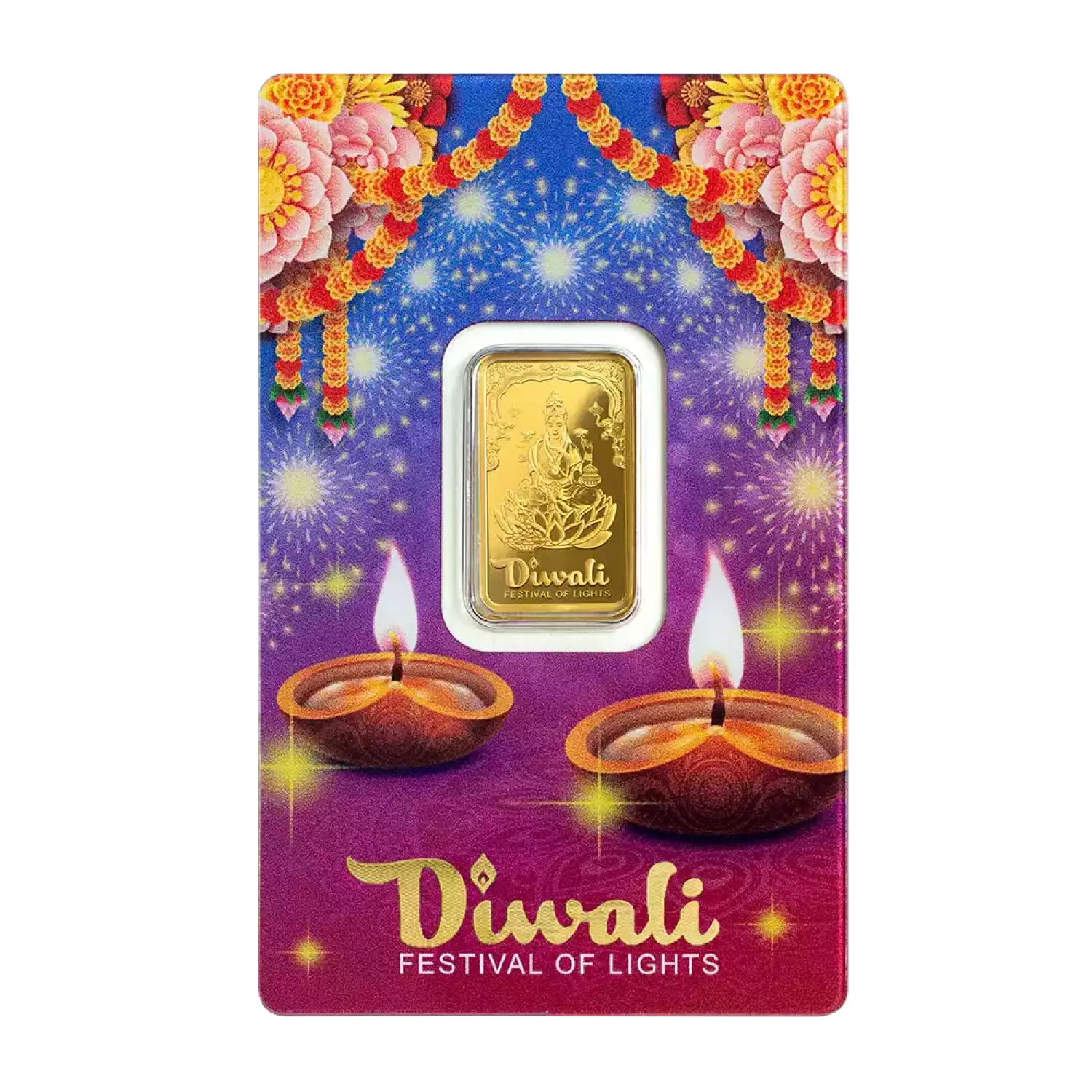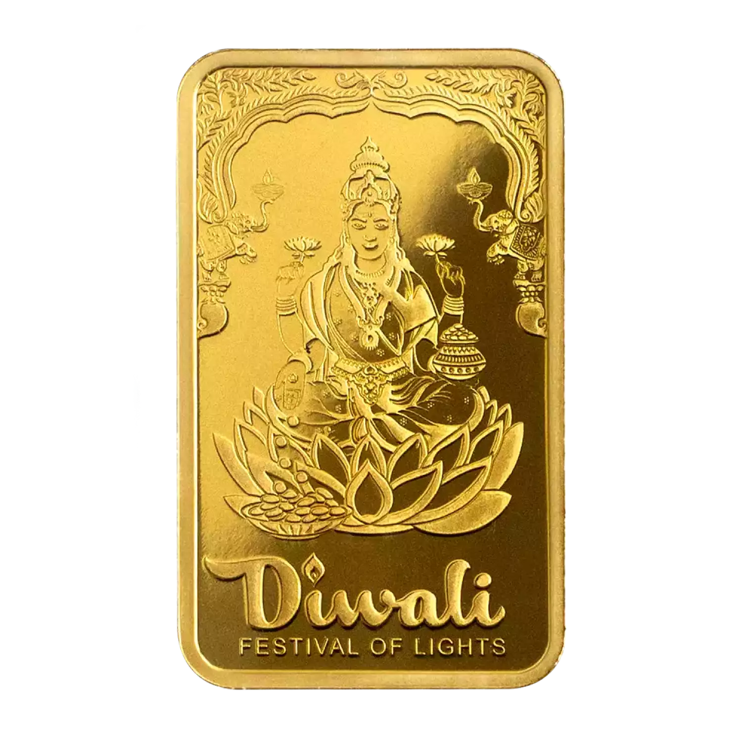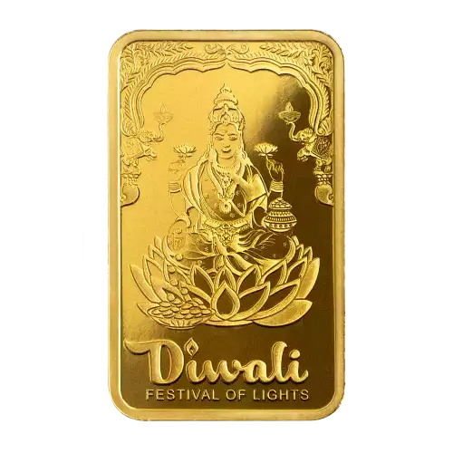 Diwali is the most important festival celebrated by followers of Hinduism as well as some other religions that are common in South Asia. This Festival of Lights has various legends associated with it that involve the Hindu gods Rama, Lakshmi and Krishna which all celebrate the victory of good over the evil and wishes for hope, happiness and peace. Lakshmi is perhaps the most popular god during Diwali as she represents wealth, beauty and prosperity. Lakshmi is also referred to as Gaj Laxmi - Goddess of elephants. Elephants symbolize strength, water and fertility to bring about abundant prosperity. This limited mintage 5g pure gold bar celebrates Diwali with Lakshmi, packaged in a vibrantly colored CertiPAMP card and envelope accented with lotus flowers.