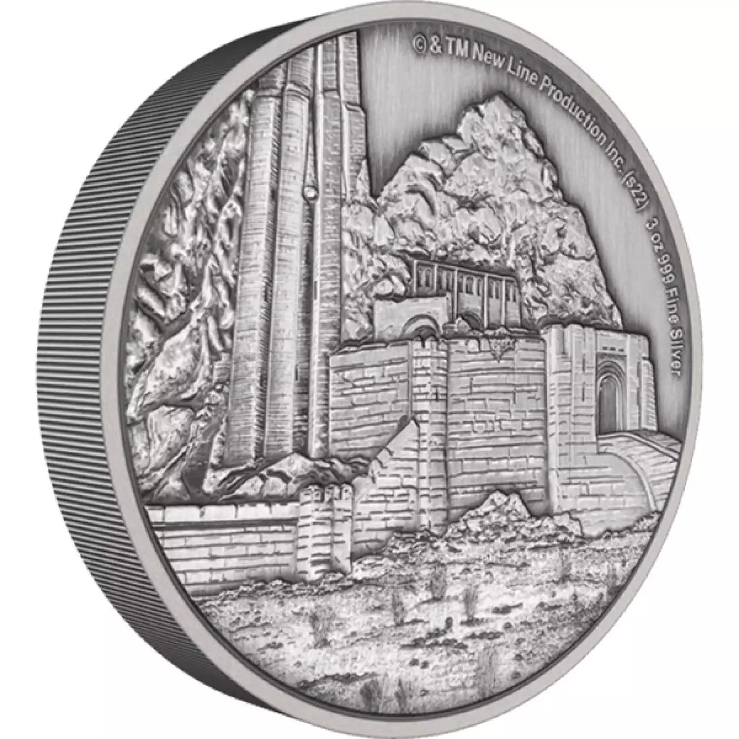 Created in partnership with Warner Bros. Consumer Products, this 3oz silver coin presents the great fortress, Hornburg in Helm’s Deep, from THE LORD OF THE RINGS™. It is fully engraved and antiqued, with relief added to enhance this powerful design.