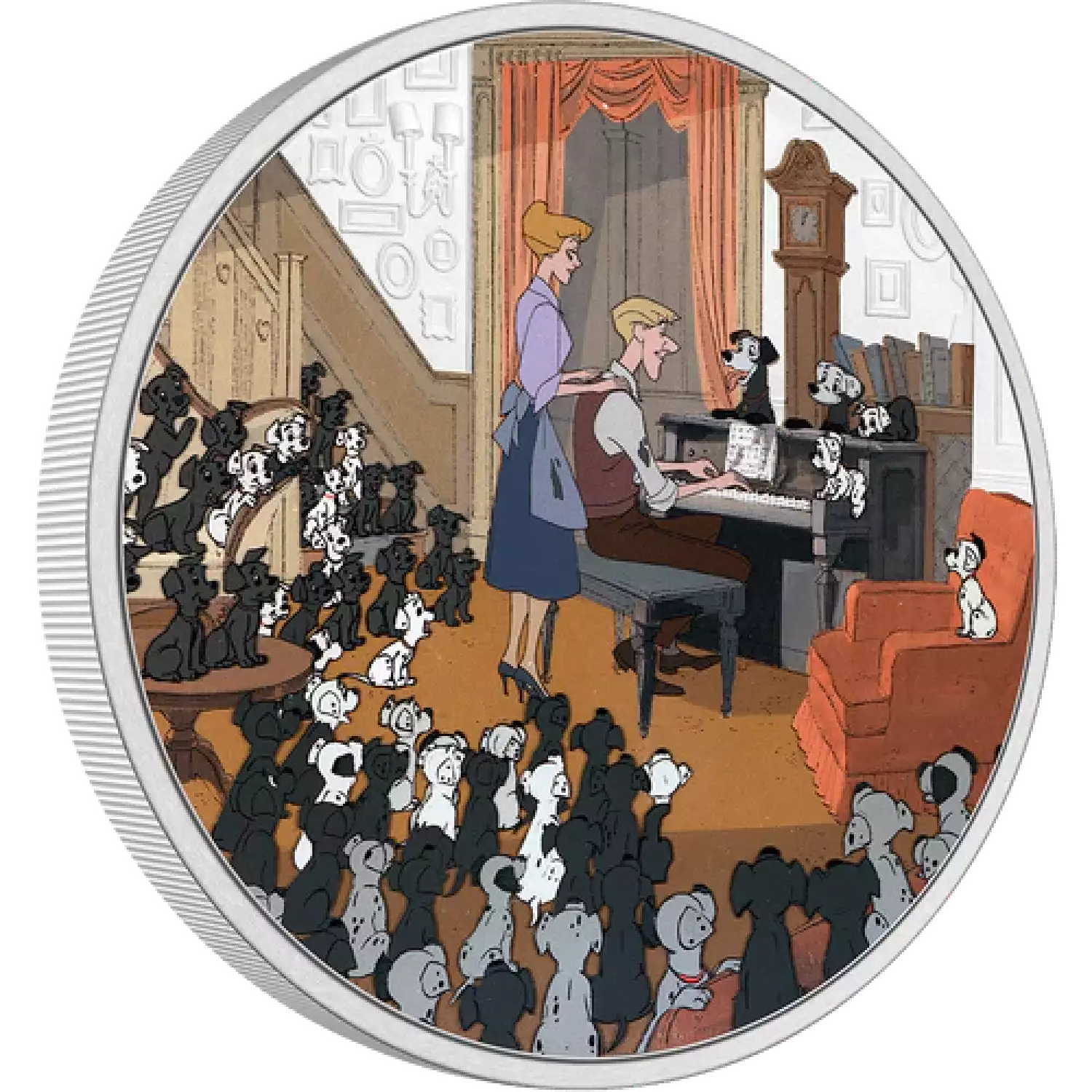 This coin features the endearing final moment in Disney 101 Dalmatians where Roger and Anita are singing together, surrounded by their 101 dogs. Made of 1oz pure silver, the image is mostly in colour but for contrast, the wall has been engraved and frosted.