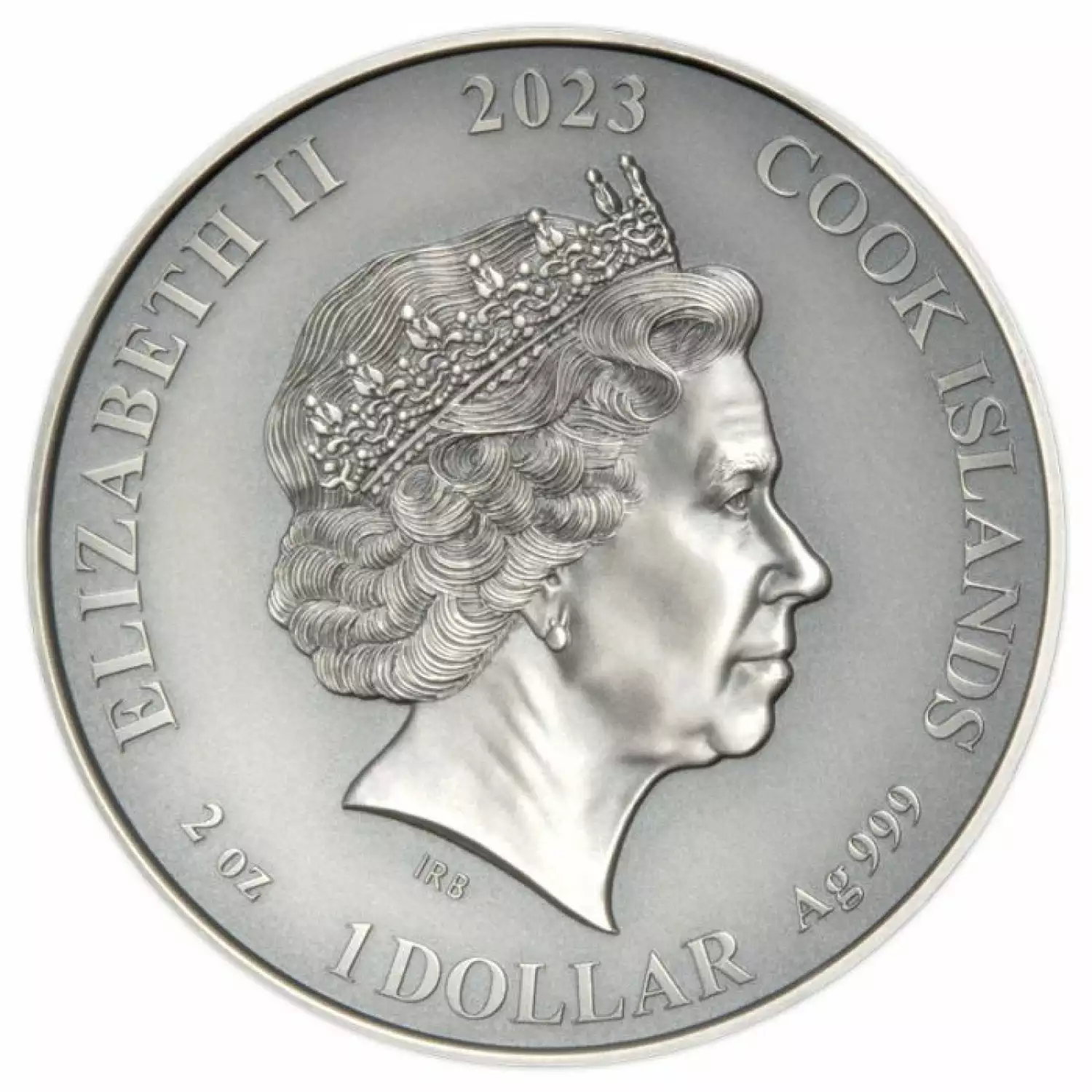 This 2023 Hel coin contains 2 Troy oz. of .999 fine silver. The coin features dramatic high relief imagery. The coin's elegant antiqued finish is accented with 24 karat gold.