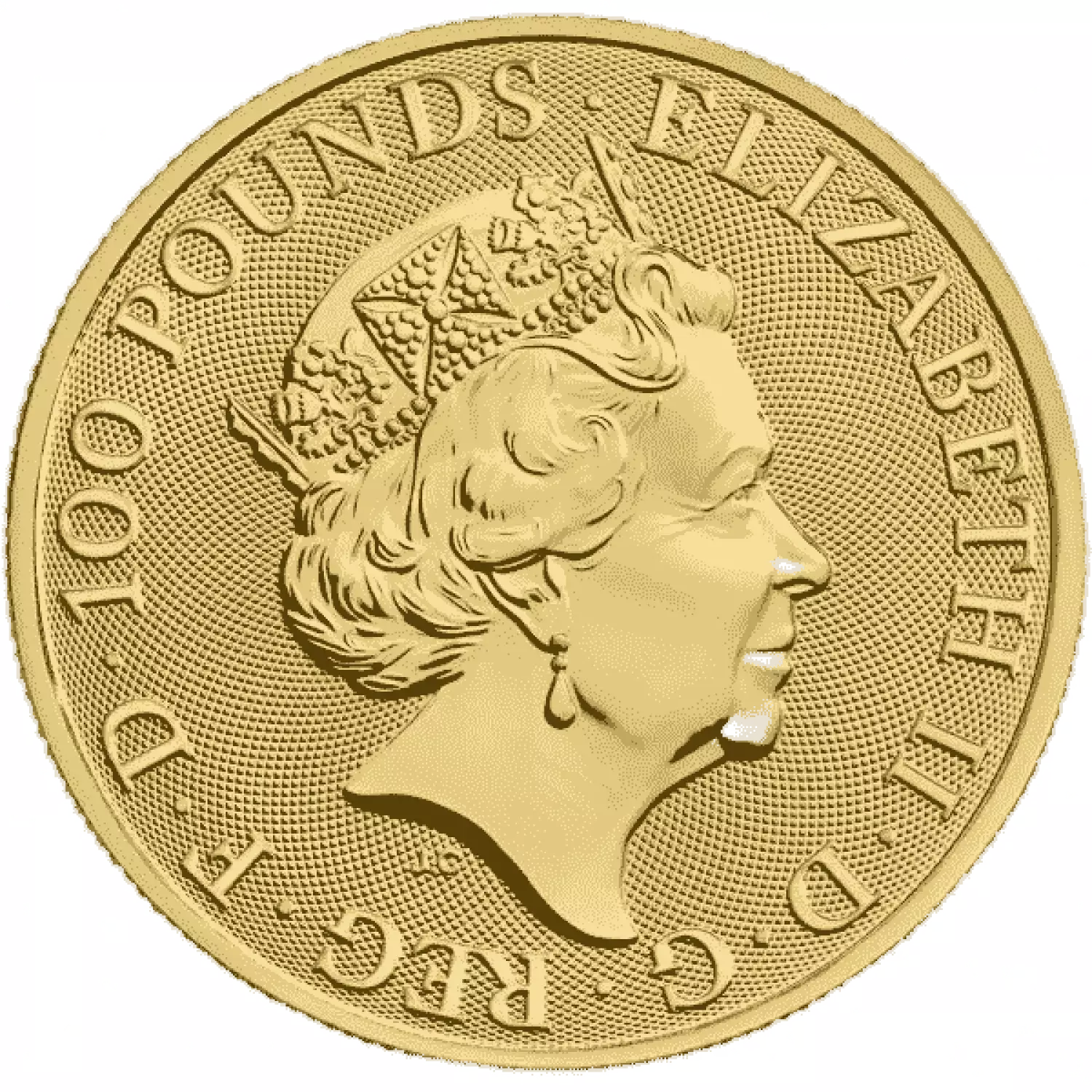 The obverse features the 5th definitive coinage Portrait of Queen Elizabeth II, surrounded by the text "ELIZABETH II • D • G • REG • F • D • 100 POUNDS". The initials of the artist Jody Clark appear just below the portrait.