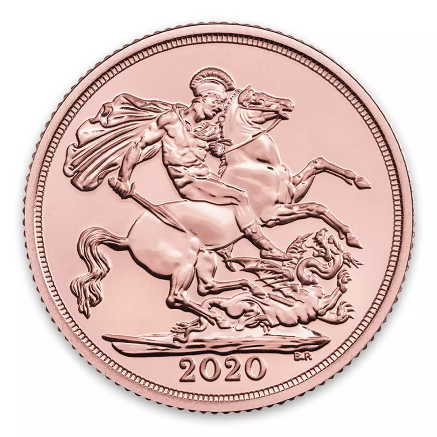 The 2020 Double British Gold Sovereign is one of the world’s most popular gold bullion coins. The British Gold Sovereign weighs .4708 troy ounces and contains 22 carat of gold. The reverse of the coin depicts a representation of St. George fighting a dragon with his sword and it was designed by Benedetto Pistrucci.