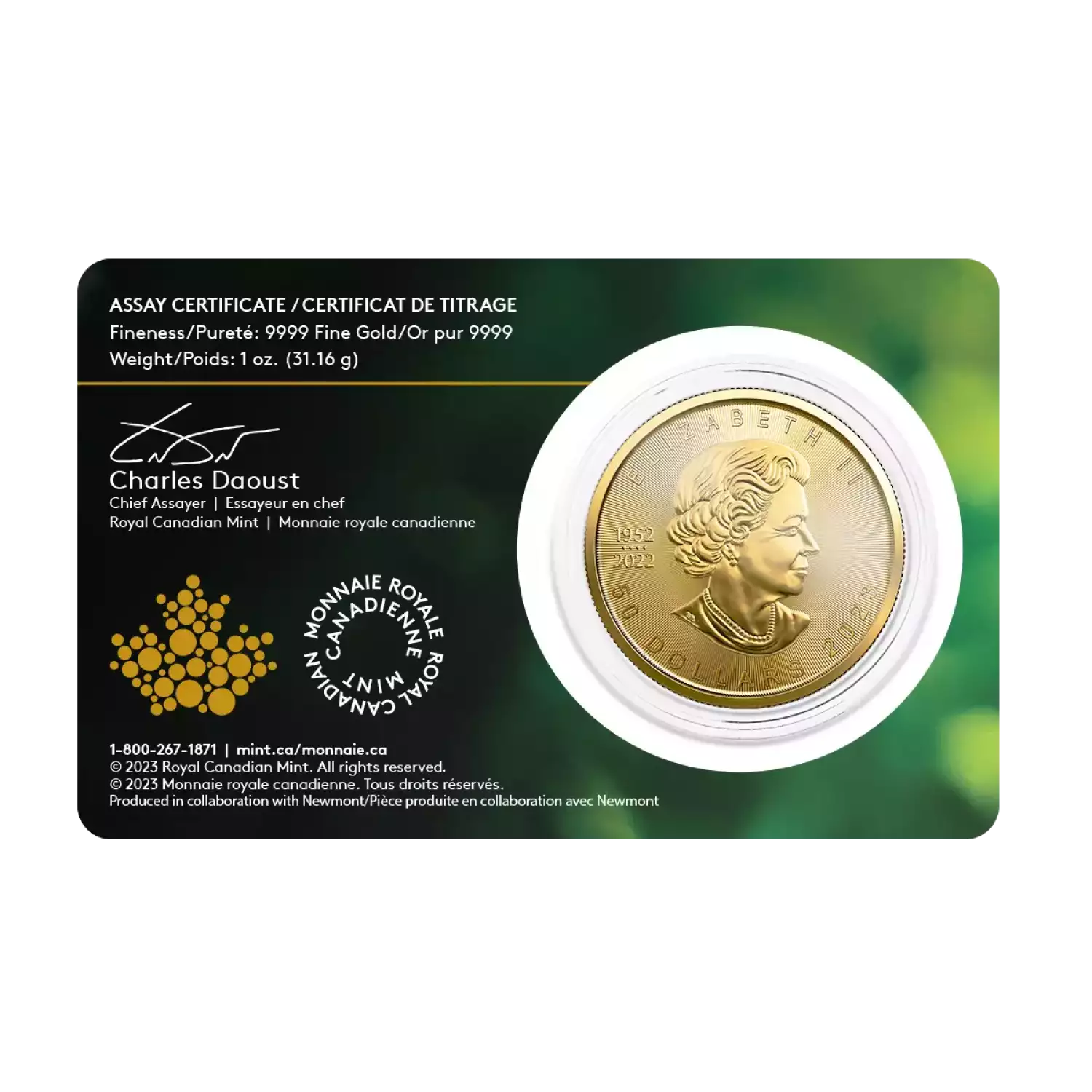 Weight: The Canadian Gold Maple Leaf is available in various weights, including 1/20 oz, 1/10 oz, 1/4 oz, 1/2 oz, and 1 oz. Each weight signifies the actual gold content in troy ounces.