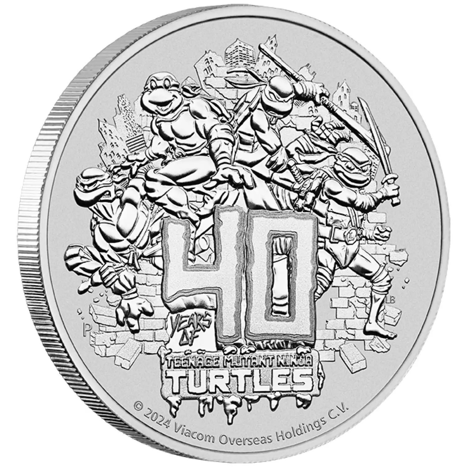Diversify your investment portfolio and add a touch of Turtle Power to your collection with the 2024 1 oz Tuvalu Silver 40th Anniversary Teenage Mutant Ninja Turtles Coin. Order yours today and get ready to join the Turtle Squad!