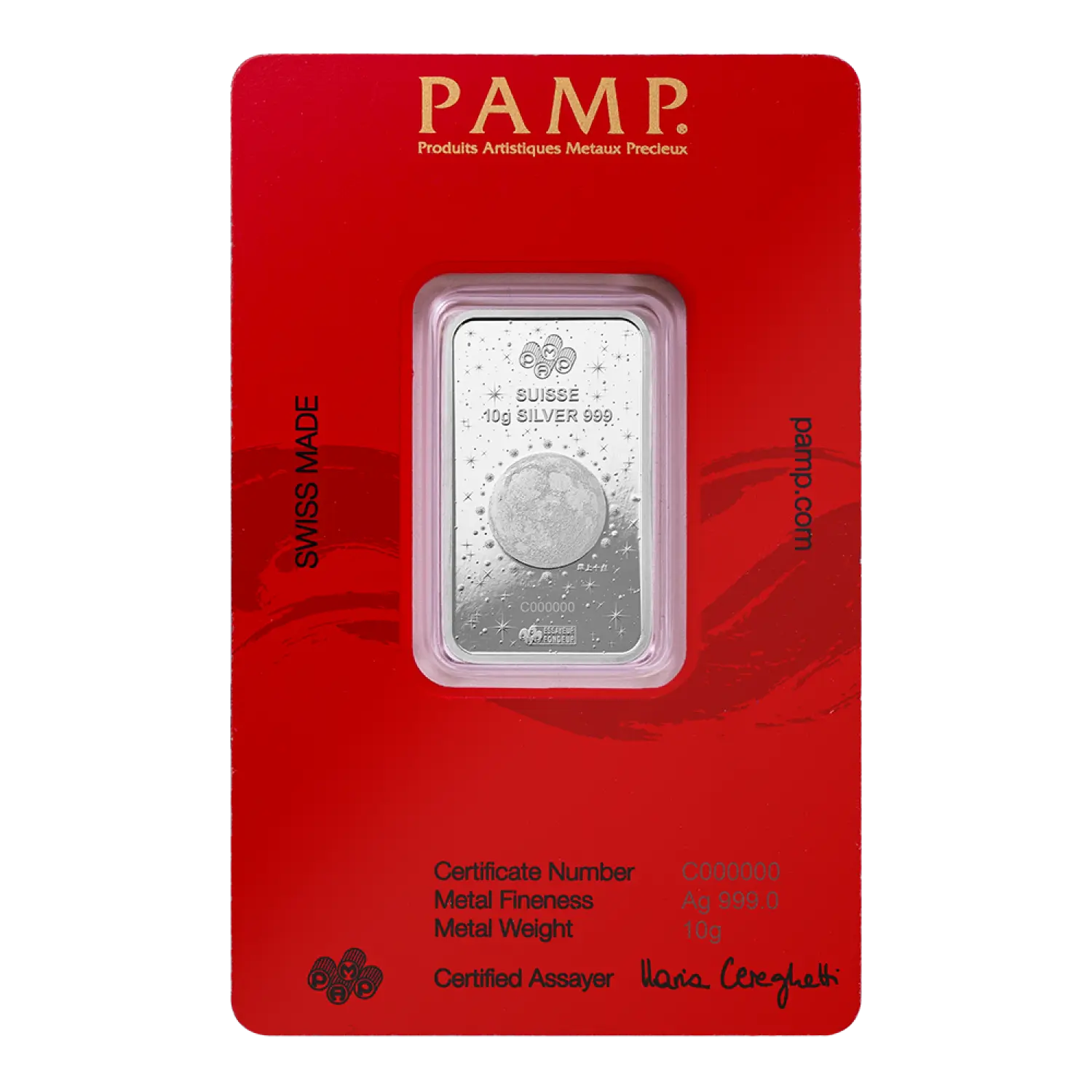 The reverse side of the bar bears the PAMP hallmark, along with the weight, metal type, and purity. Each bar is carefully packaged in a sealed assay card, guaranteeing its authenticity and quality.