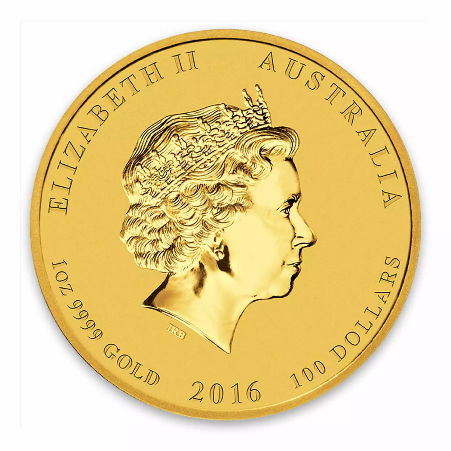 The 2016 1 oz Australian Perth Mint Gold Lunar II: Year of the Monkey is backed and guaranteed by the government of Australia and has a legal tender value of 100 AUD. The obverse of this gold coin features a new effigy of Queen Elizabeth II and the Reverse displays an adult monkey peering back over its shoulder as it sits on a peach tree.