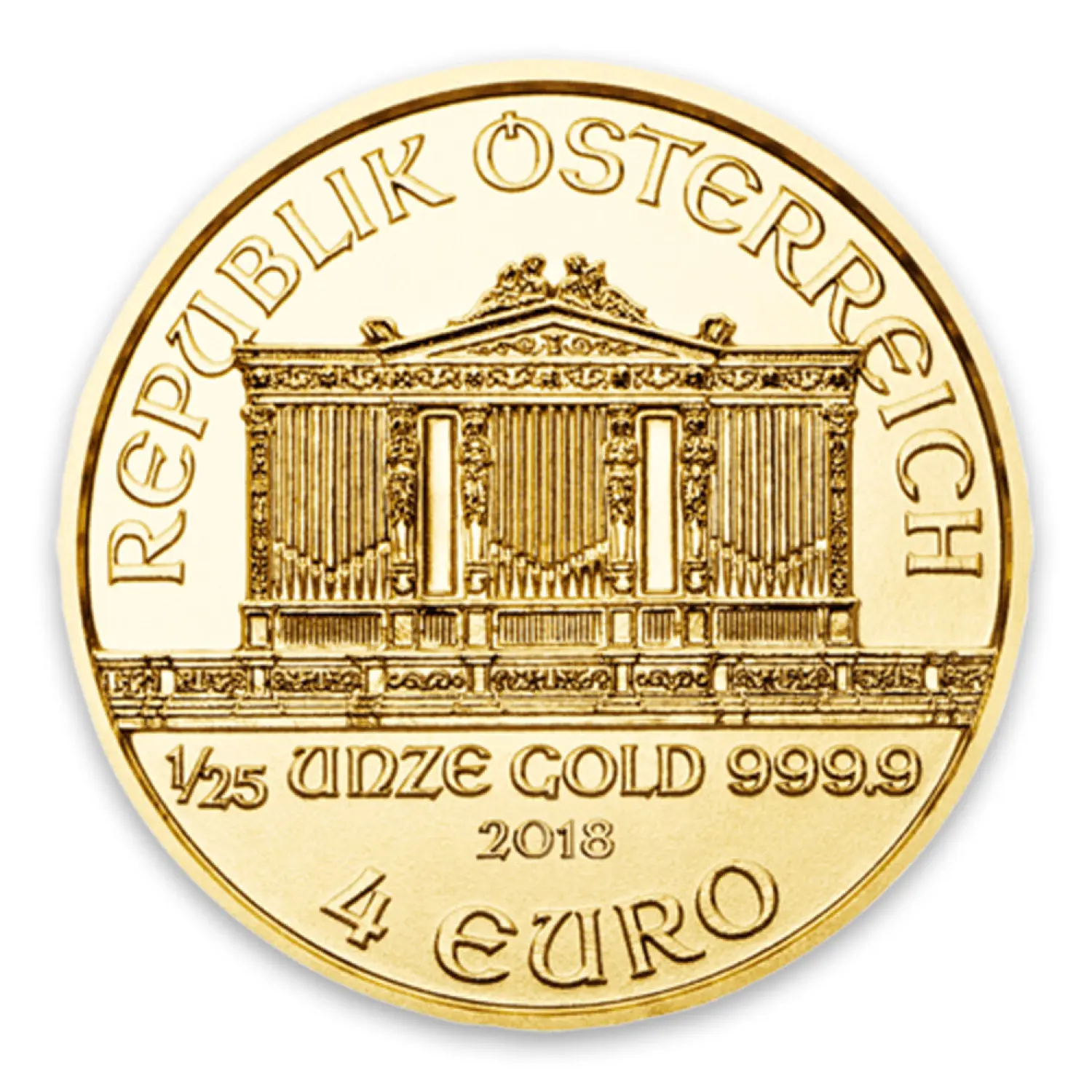 The 1/25 oz Austrian Gold Philharmonic is a classically styled .9999 fine gold coin, backed by Austria.
