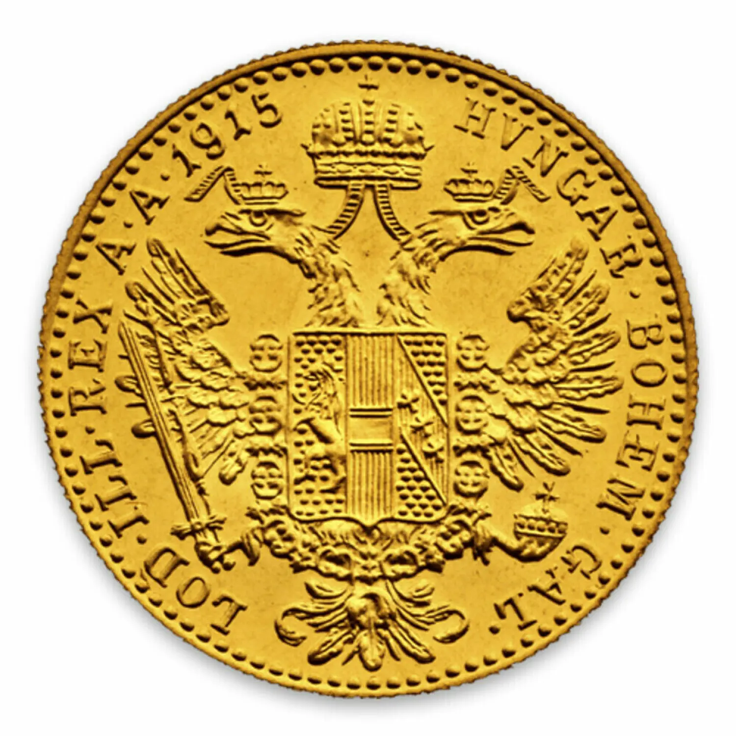 The Obverse of this Austrian gold coin features a right facing bust of Franz Joseph I, emperor of Austria-Hungary, surrounded by the legend in Latin. These strikingly beautiful 10 Corona coins are struck by the Austrian Mint.