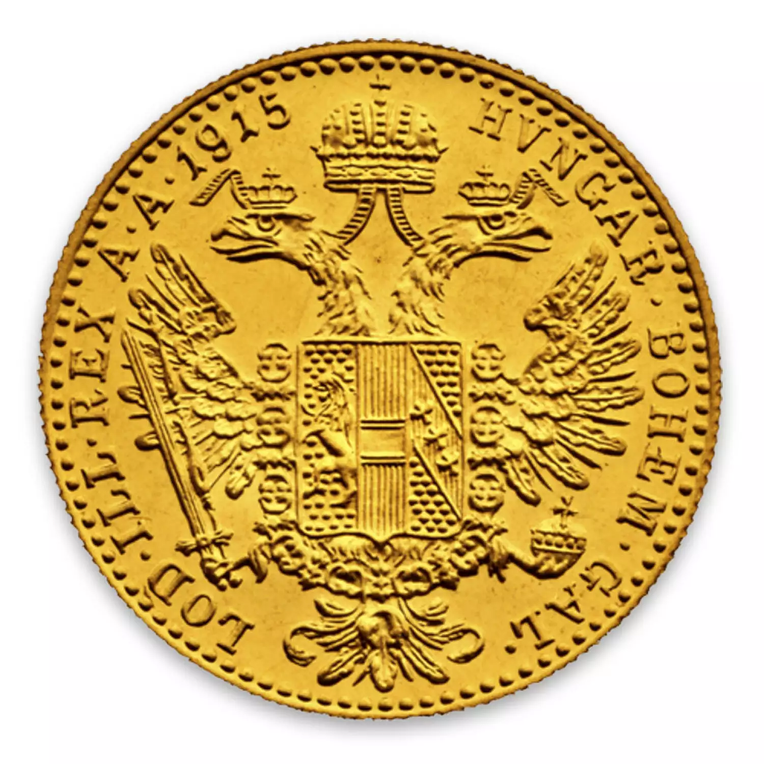 The reverse side of Modern Re-strikes 1 Ducat Coins features the Austro-Hungarian Empire’s coat of arms. The obverse displays a young effigy of Franz Joseph I.
