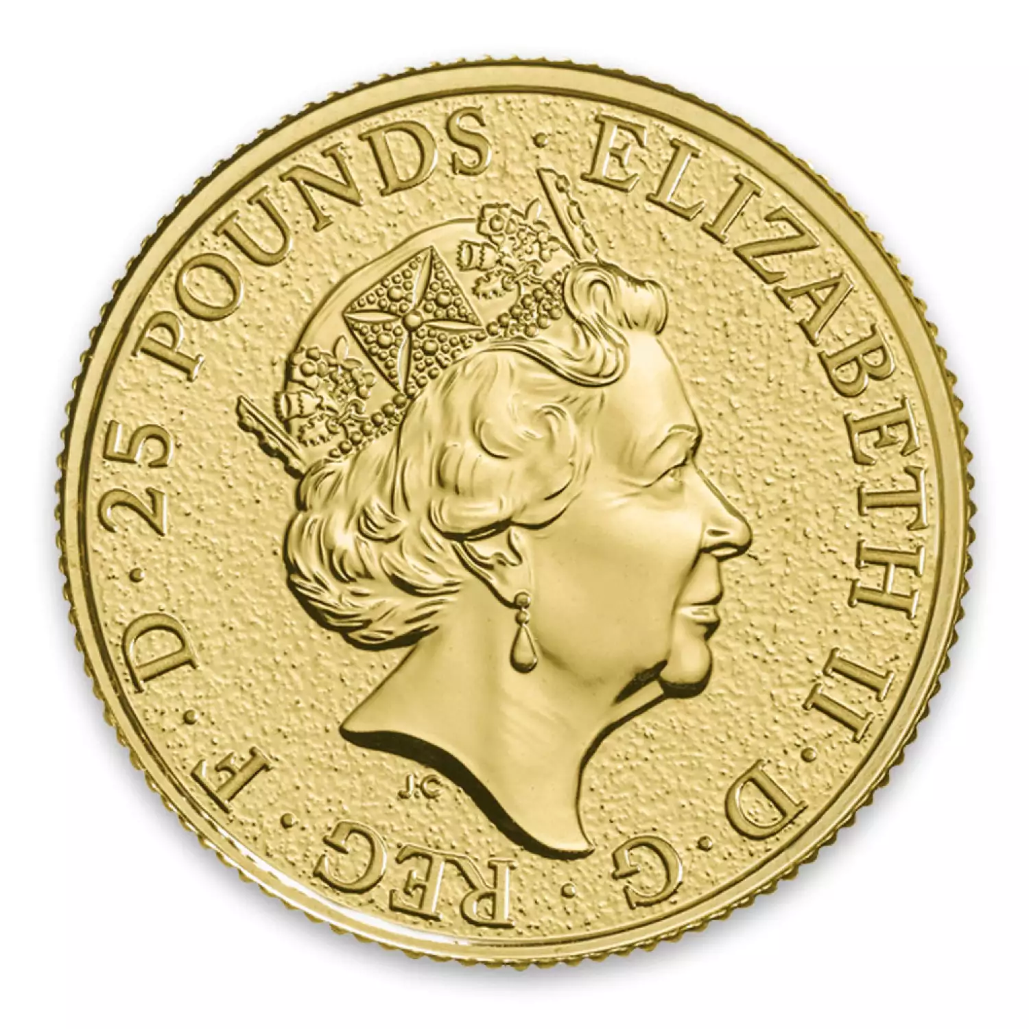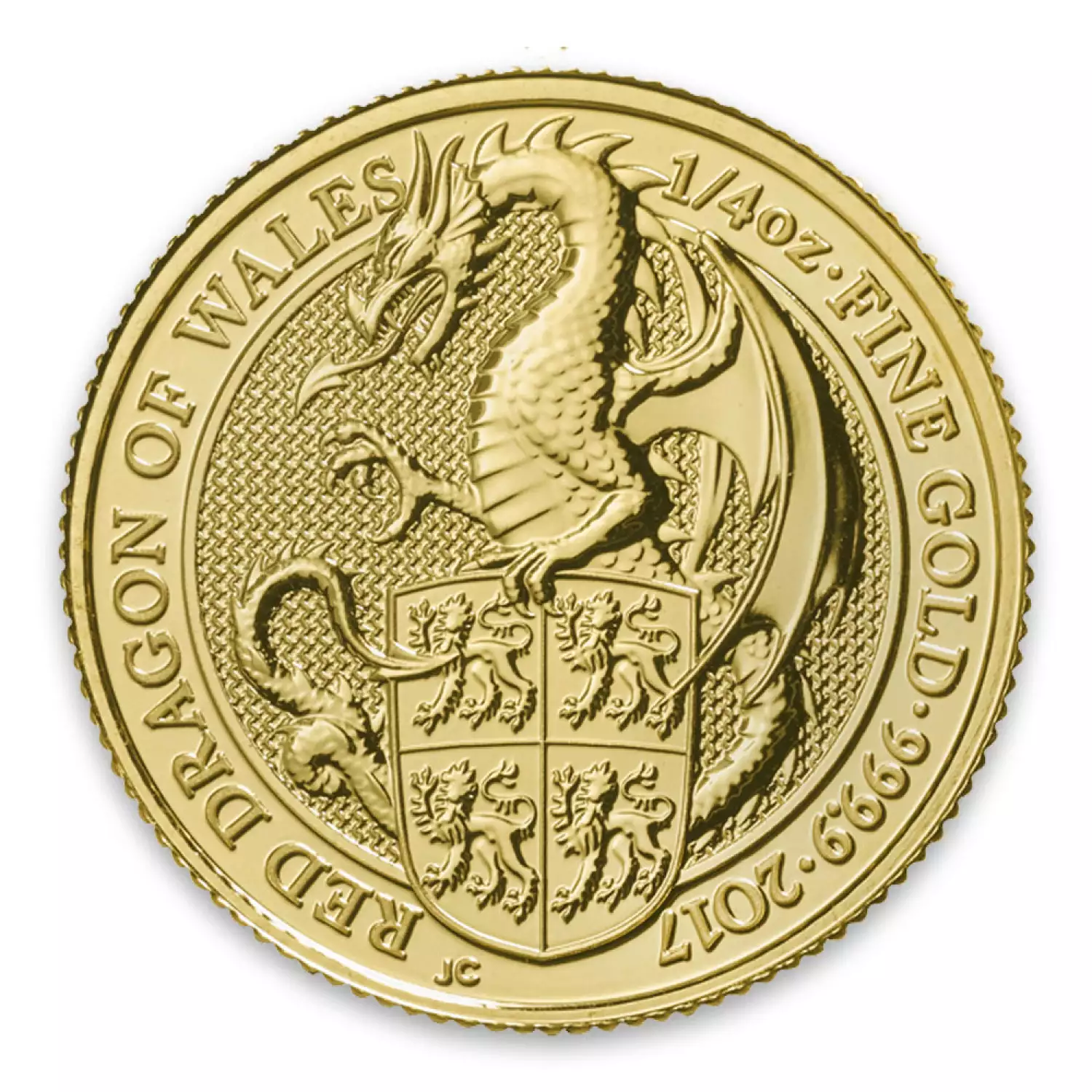 The 1/4 oz 2017 Britain Queen's Beasts: The Dragon is made of .9999 fine gold and weighs 0.25 Troy oz.