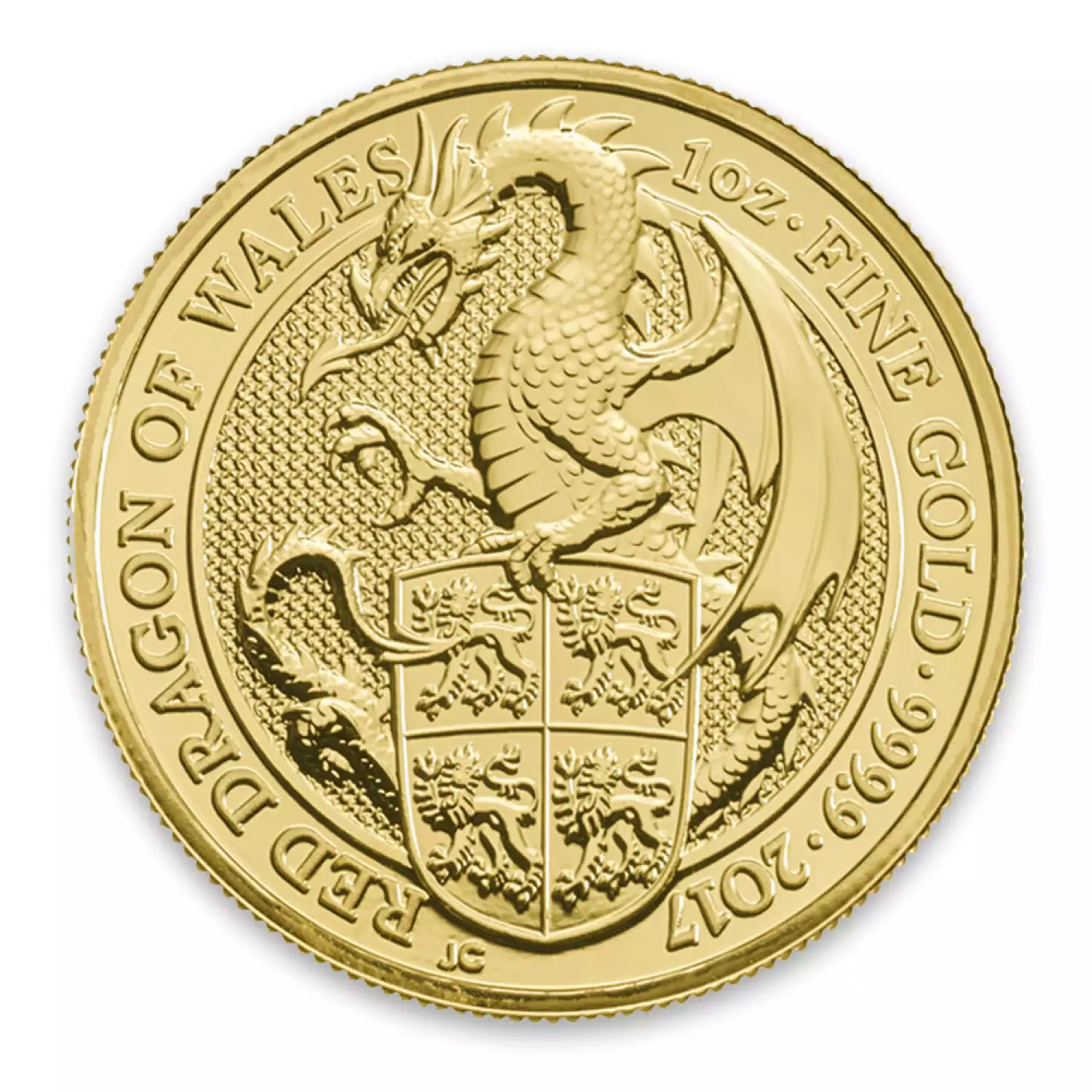 The 1 oz 2017 Britain Queen's Beasts: Red Dragon of Wales is made of .9999 fine gold and weighs 1 Troy oz. This is the third release in the Queens Beast Series and issued a face value of 100 (GBP) by the British government.